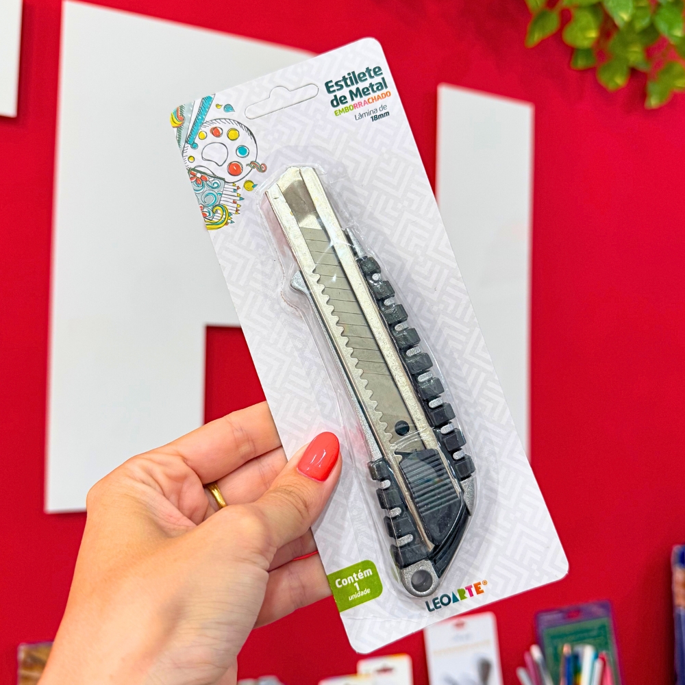 O Estilete de Metal Emborrachado Leoarte é uma ferramenta robusta e durável, ideal para cortes mais exigentes. Com estrutura metálica resistente e design ergonômico, ele oferece maior estabilidade, precisão e segurança no manuseio. A lâmina de 18mm proporciona cortes eficientes em diversos materiais, sendo indispensável para quem trabalha com papelaria, marcenaria, artesanato, personalização e muito mais.