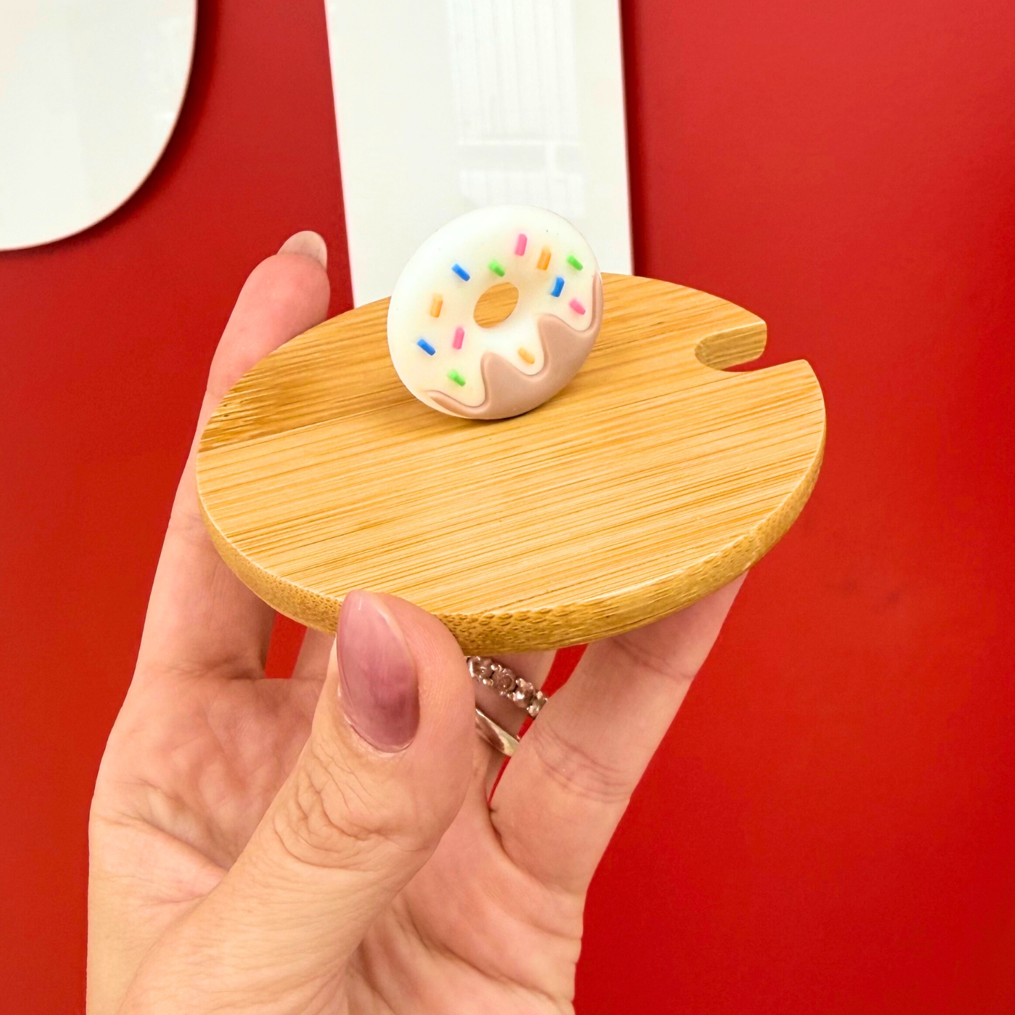Adicione mais valor às suas canecas com a tampa de bambu com puxador em formato de donut. Um acessório que une funcionalidade e apelo visual, ideal para transformar produtos simples em peças mais completas e atrativas.